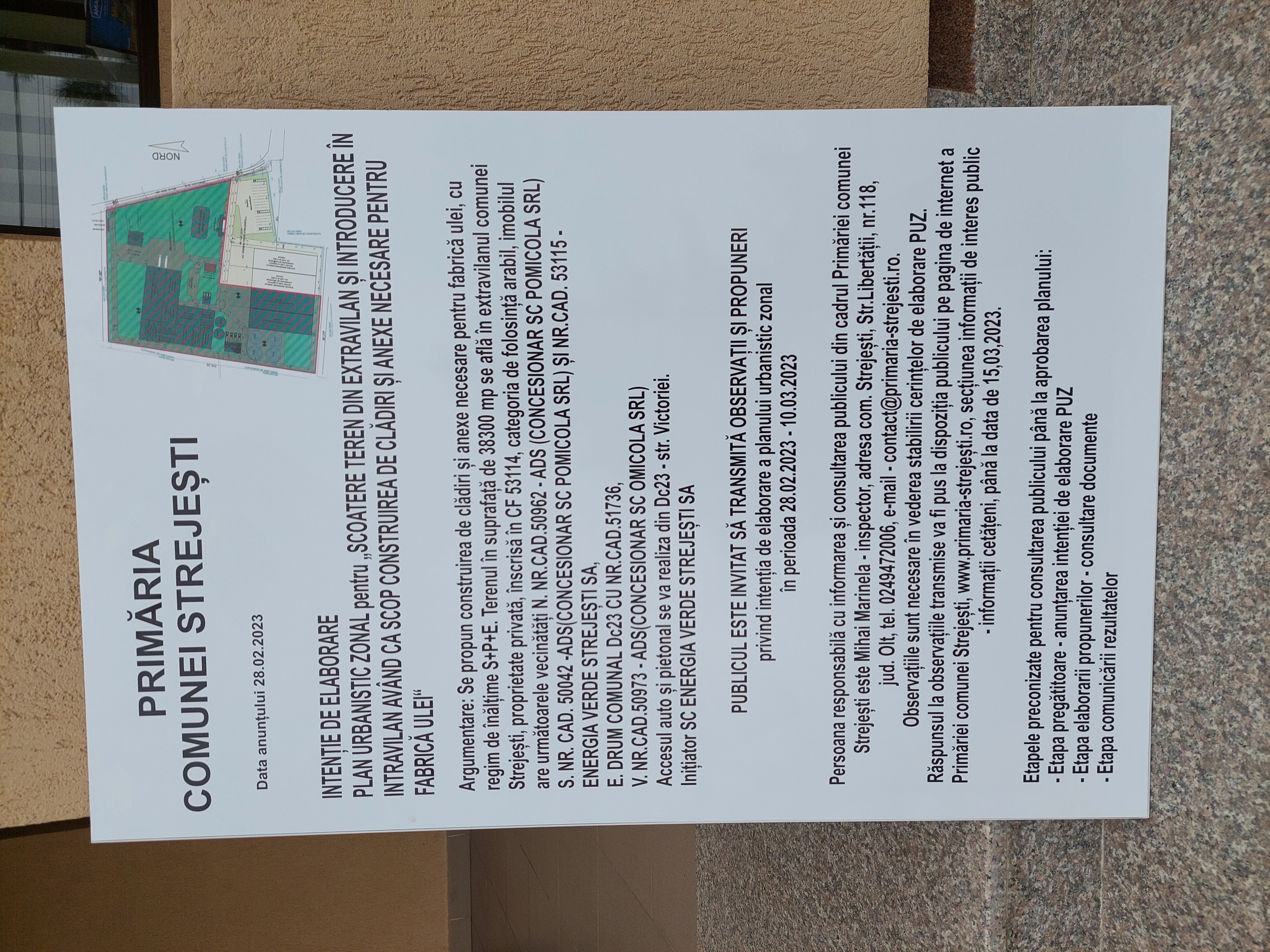 Anunt intentie de elaborare PUZ - Infiintare centrala electrica fotovoltaica Strejesti